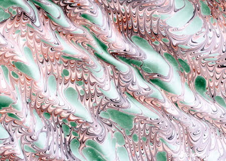 A traditionally marbled paper using combs, stylus or rakes in classical patterns that include peacock-tailed feather patterns, stone marble and veined marble patterns, French curls, sun spot and dragon skin patterns. Hand marbled in Florence, Italy.